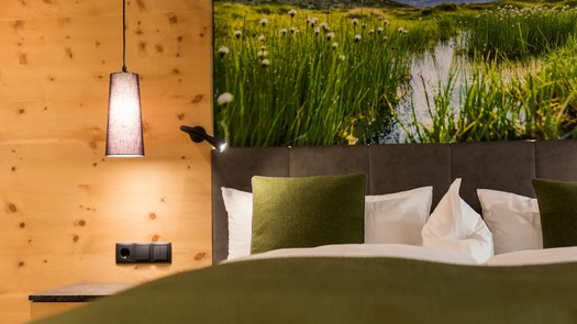 Beide Zirben Panorama Zimmer im modernen Tiroler Stil mit Zirbenholz Möbel und Eichenholzboden sind mit hochwertigen Boxspringbetten unter einem Sternenhimmel, gemütlicher Sitzecke, Bad mit Freeflow Luxusdusche und getrenntem WC sowie mit 2 Balkonen zur Tal- & Gartenseite, 3 Flat-TV, Telefon, Safe, Kühlschrank, Wlan Internet und Wellness Tasche mit Bademantel ausgestattet.