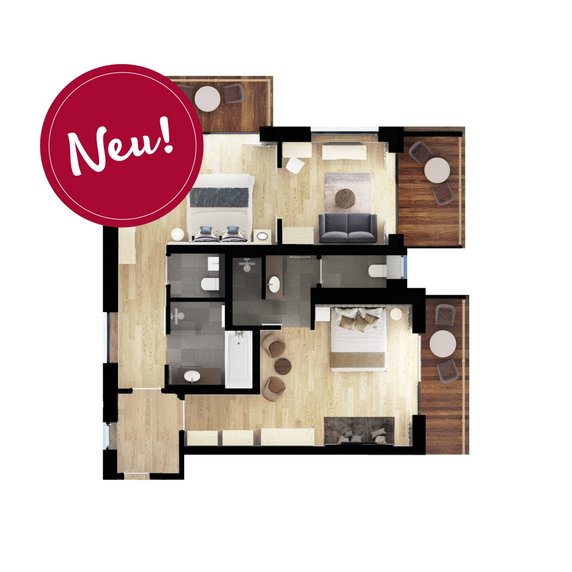 Das ElternzimmerHotelwohnung Zirbe verfügt weiters über ein Sofa mit Stockbett Funktion & Freeflow Infrarot Luxusdusche & seperater Badewanne