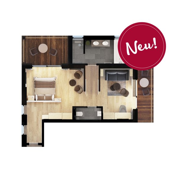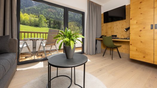 2-room apartment with a modern Tyrolean style, with pine furniture and oak wood floors, high-quality box spring beds under a starry sky, cozy seating area with bunk bed function, bathroom with free flow infrared luxury shower & separate bathtub as well as separate toilet and 2 balconies towards the sunny side of the garden & the panoramic valley side.