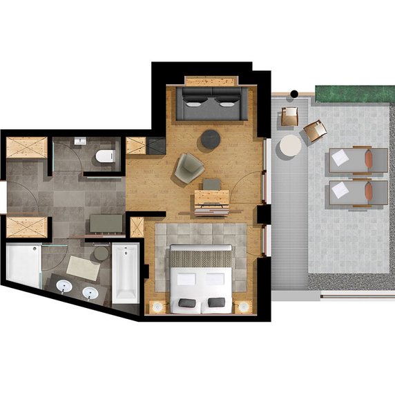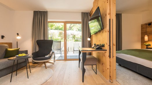 In autumn 2018 NEW renovated 2 room apartment in modern Tyrolean style with pinewood furniture with slate slabs as well as Oak wood floor, high quality boxspring beds under a starry sky, comfortable seating corner, bathroom with freeflow infrared luxury shower & bathtub as well as separate toilet and big terrace at the garden facing the sunny side. Furthermore, the room is equipped with 2 flat-screen TV, espresso / tea machine, telephone, radio, safe, fridge, wlan and wellness bag with bathrobe.