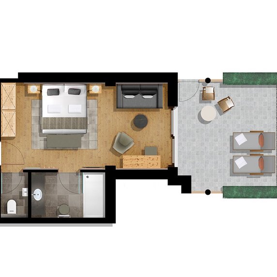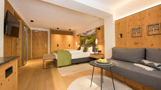 Furthermore, the room is equipped with a flat screen TV, espresso / tea machine, telephone, radio, safe, refrigerator, Wifi Internet and wellness bag with bathrobe.