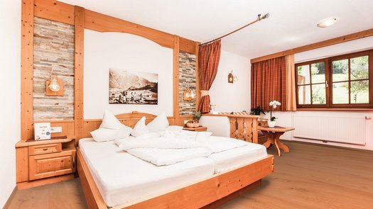Weiters ist das Zimmer mit einem Flat-TV, Telefon, Radio, Safe, Kühlschrank, High Speed Internet und Wellness Tasche mit Bademantel ausgestattet.